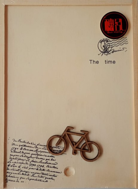 caja de madera que contiene un notebook de pasta dura con variedad en tipo de hojas.